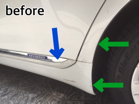 青矢印のガーニッシュは、メッキ部分まで損傷がありますので