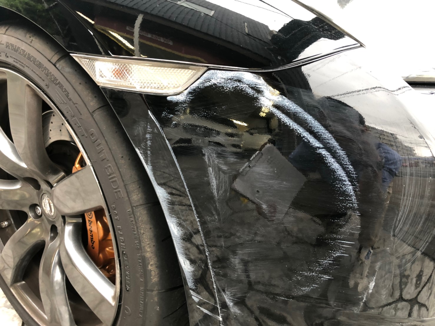 バンパーもフェンダーと同様、色が付着しているのと、ボディの塗膜が剥がれていました。