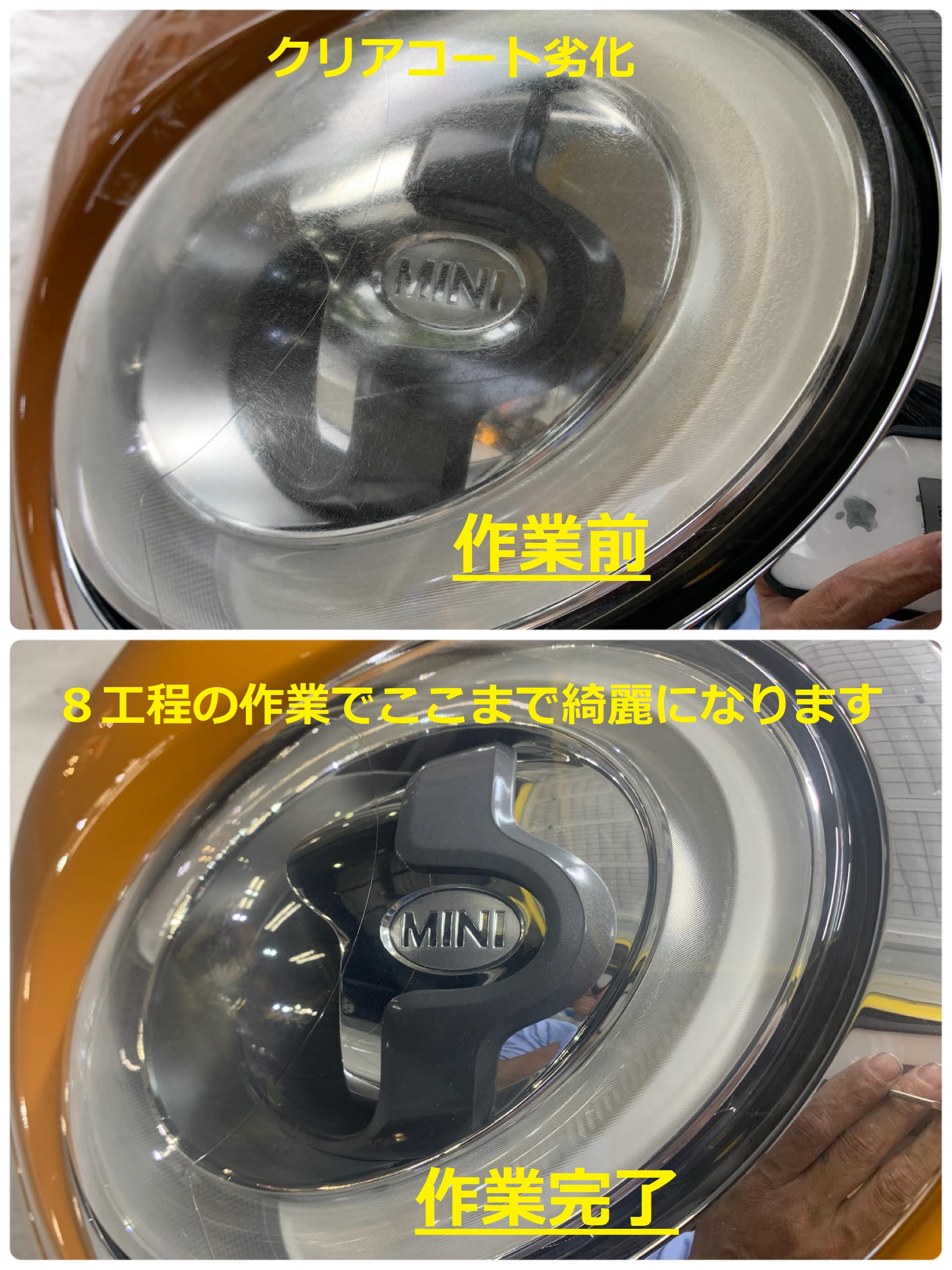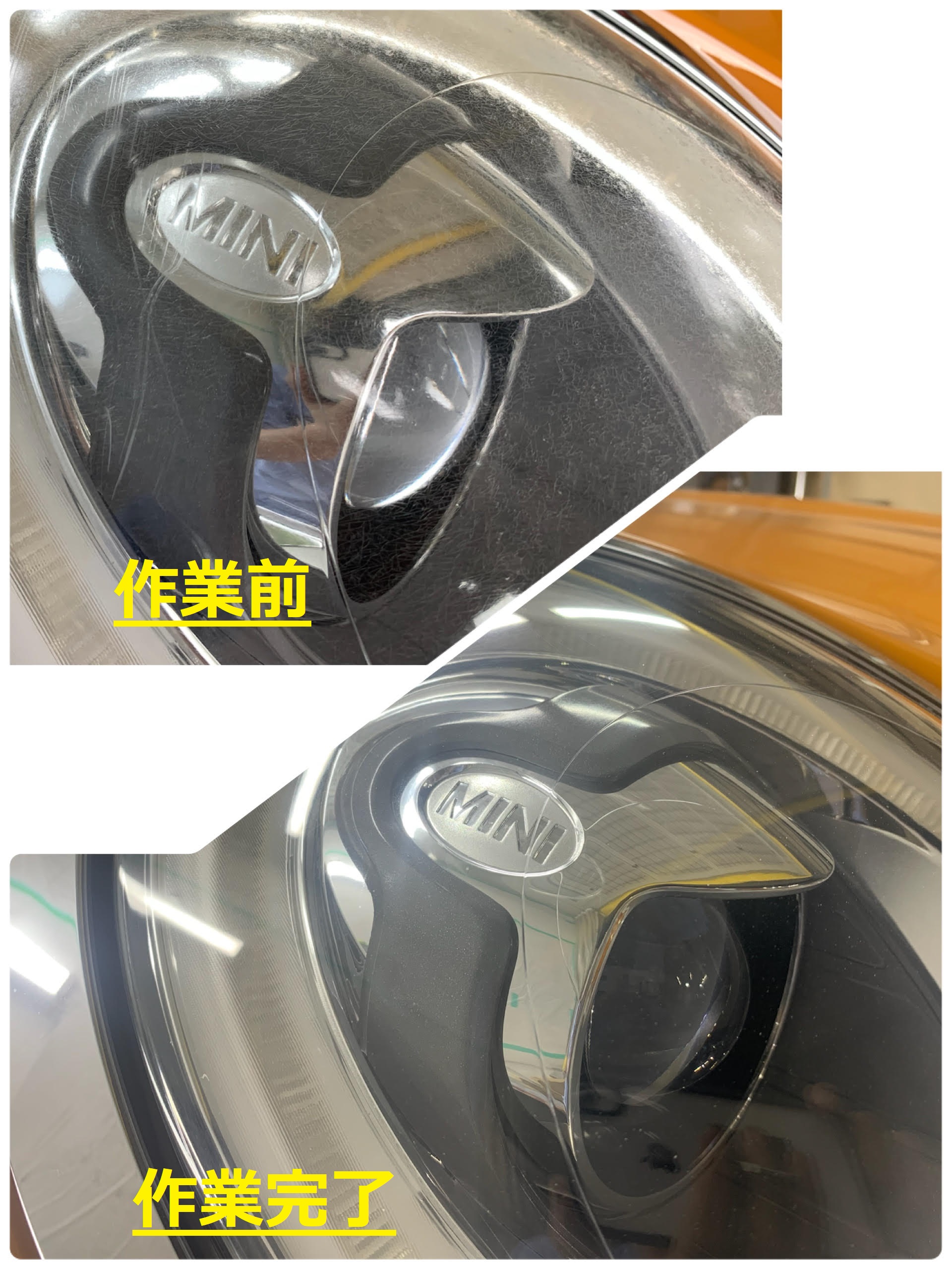 施工写真のMINIはヘッドライト交換 片側30万円と言われたようです