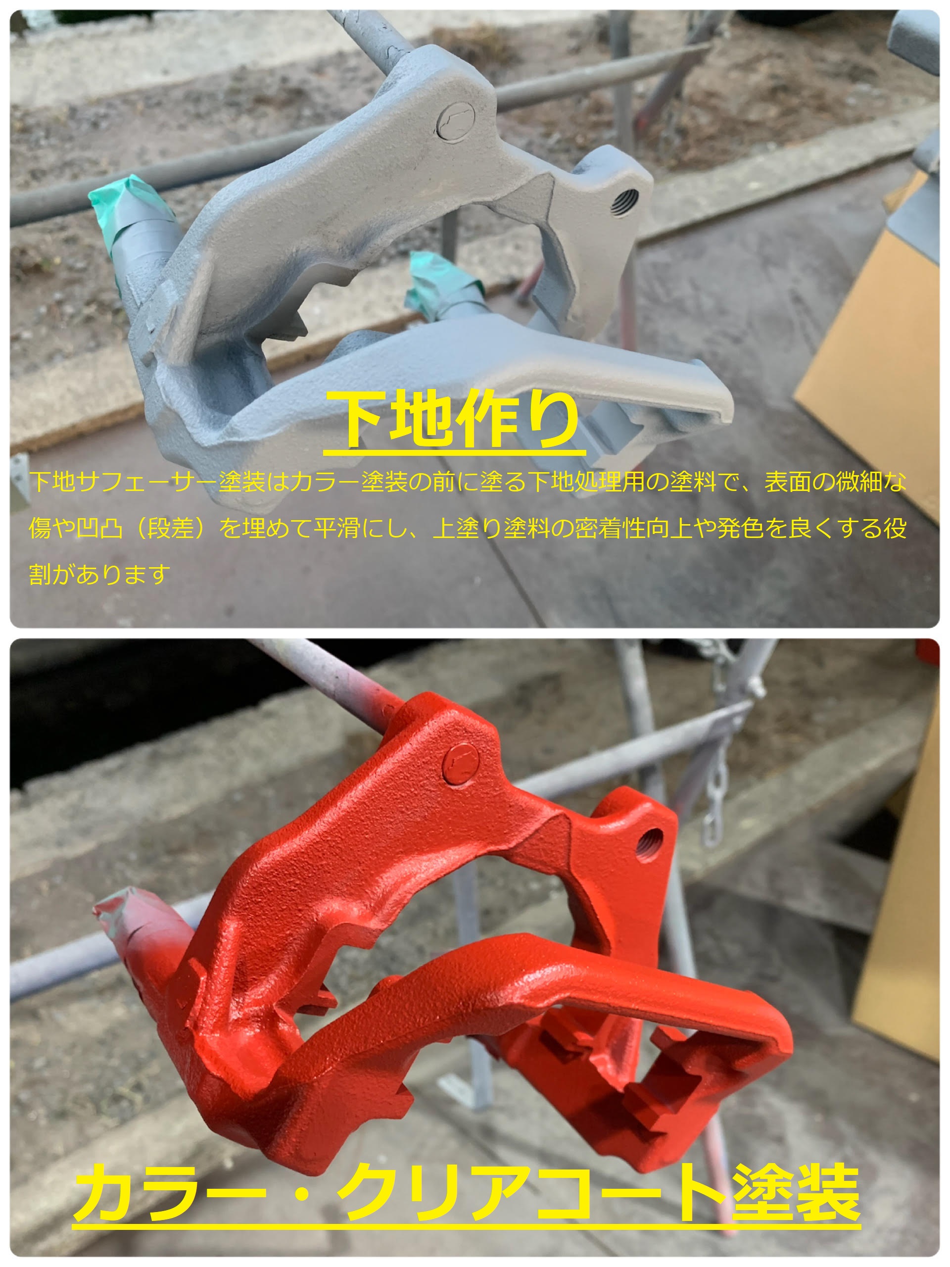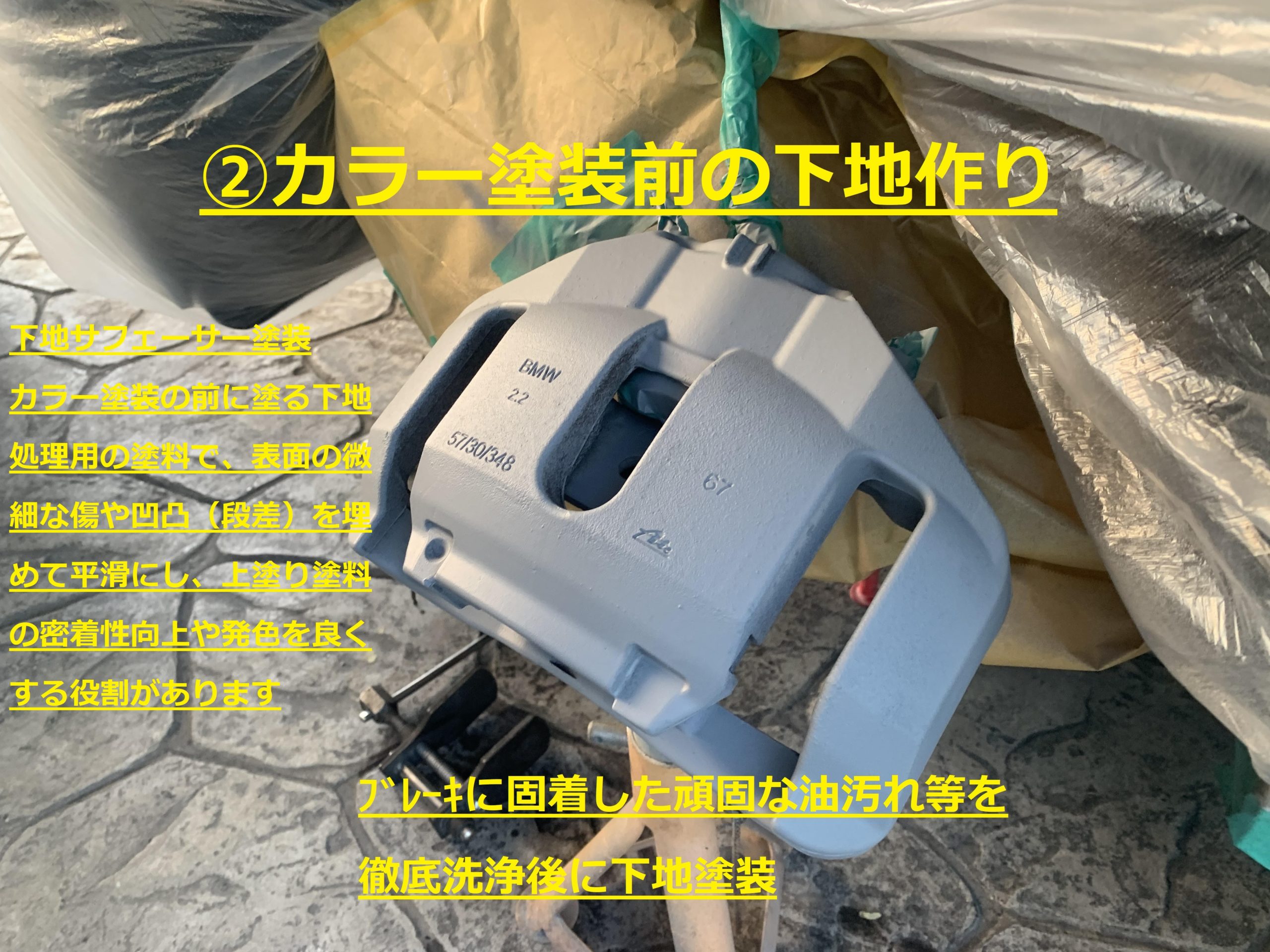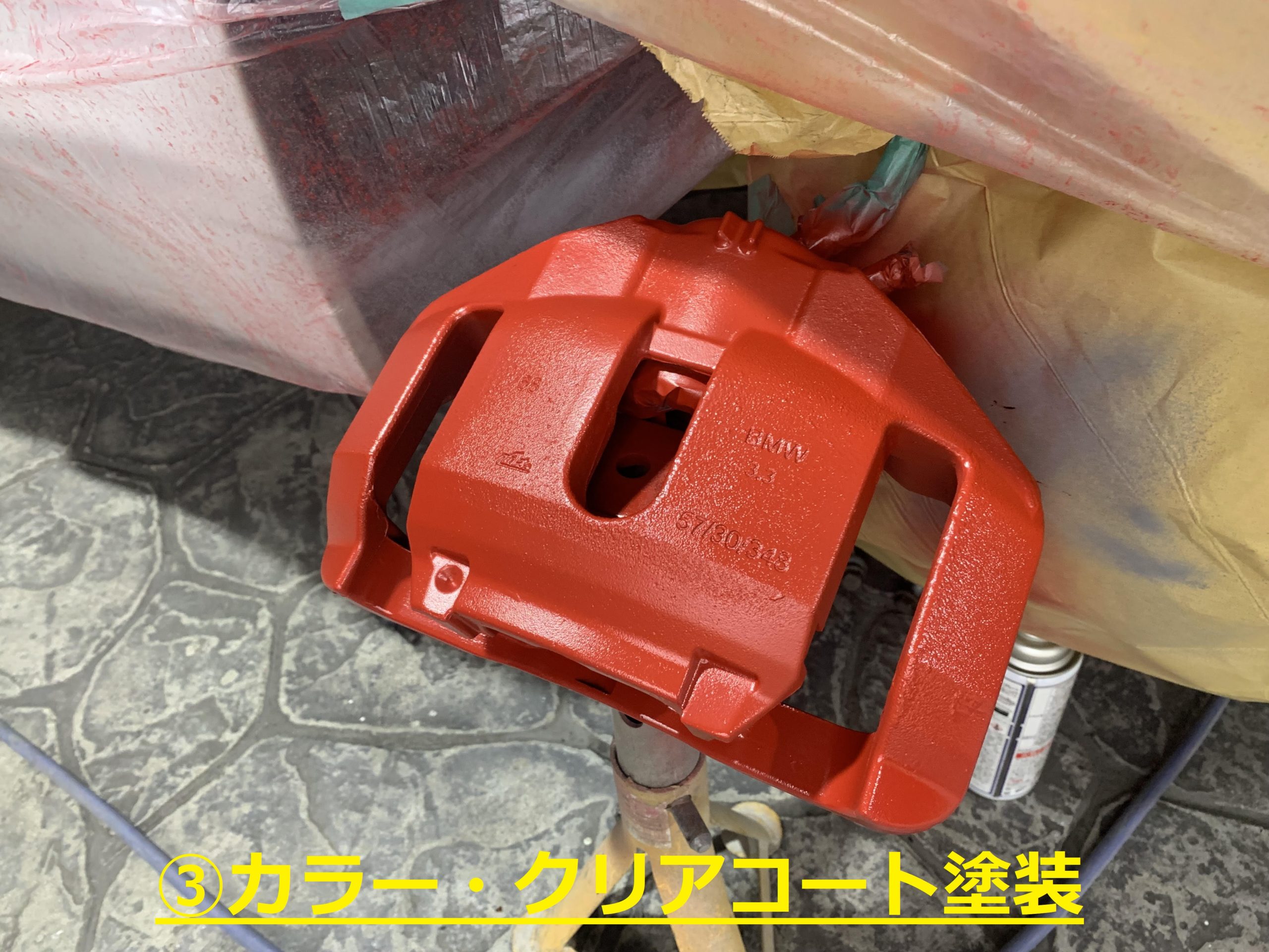 ・ブレーキ分解、洗浄・下地塗装、カラー塗装、ステッカー貼付、クリアコート塗装