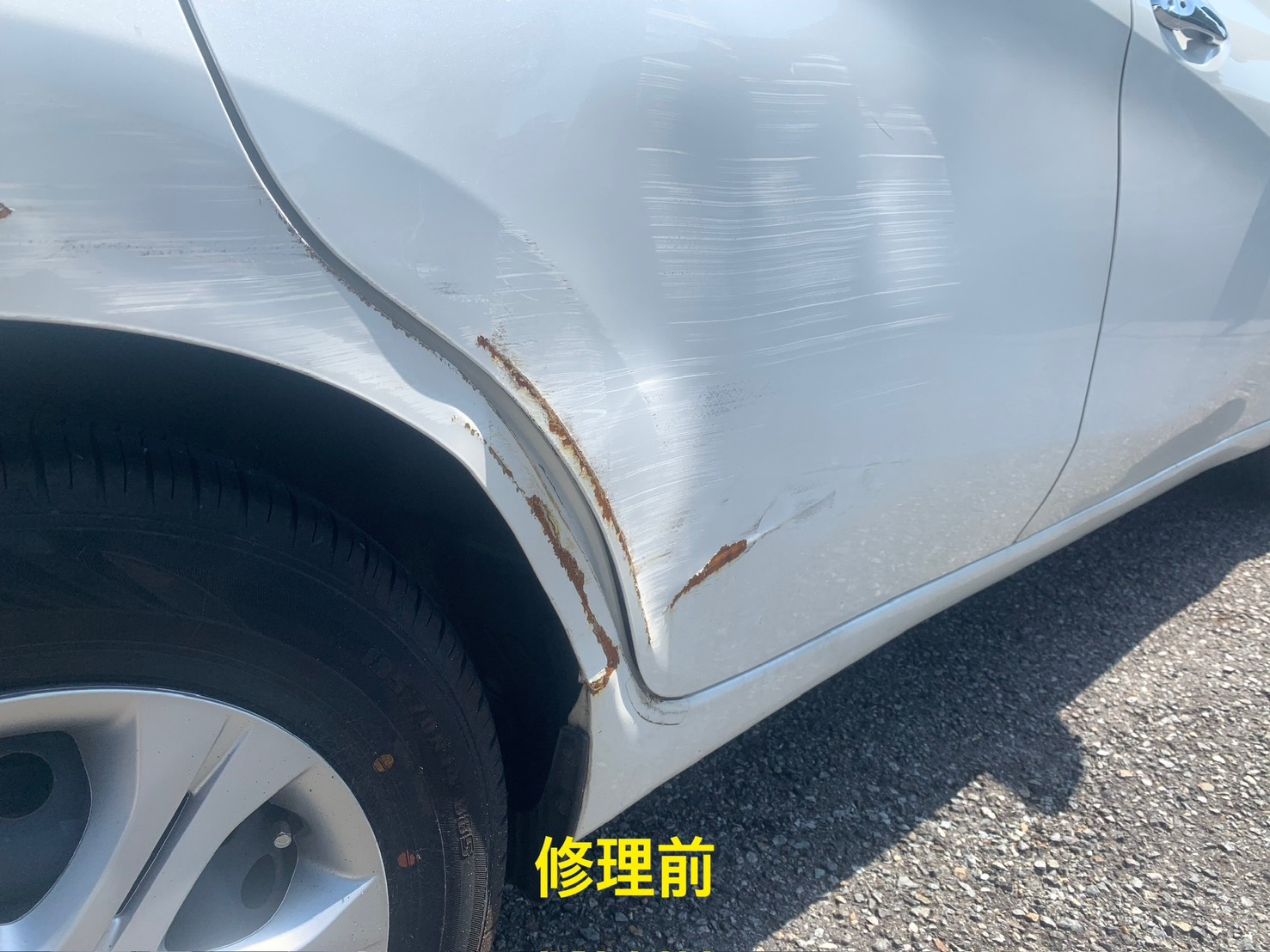 右リアドアとクォーターパネルに大きな損傷が見られ、他店ではドアとパネルの交換を勧められたそうです。